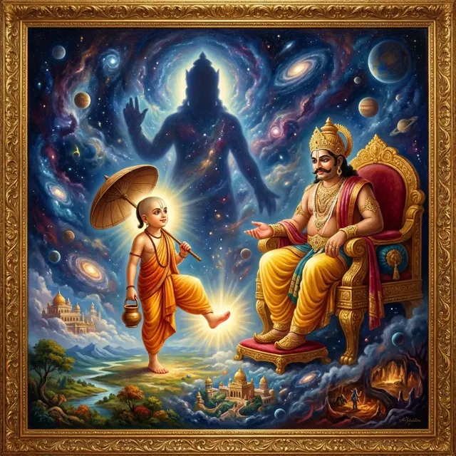 A tiny Brahmin boy asks a generous king for three paces of land — then grows to stride across the earth, the heavens, and the king's own head.