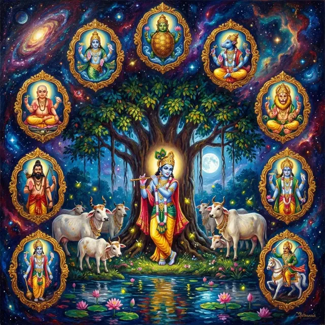 Born in a prison cell at midnight, a cowherd boy who steals butter, dances on a serpent's hood, lifts a mountain, and speaks the song of God on the battlefield.