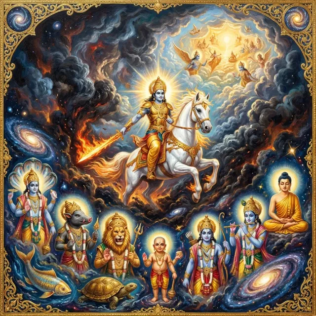 A tiny fish in a king's cupped hands grows to fill the ocean, warns of the deluge, and pulls the boat of creation across the waters of dissolution.
