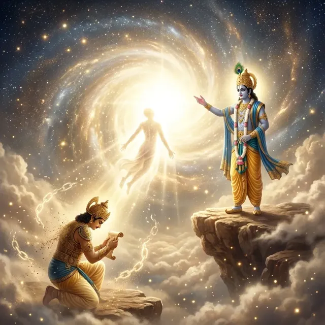 Krishna's ultimate teaching is to abandon all varieties of dharma and surrender completely unto Him alone. He promises to liberate from all sins. This is the essence of the Gita—complete loving surrender to the Supreme with full faith.