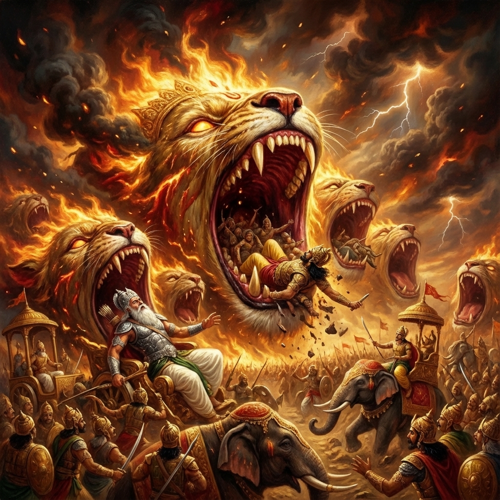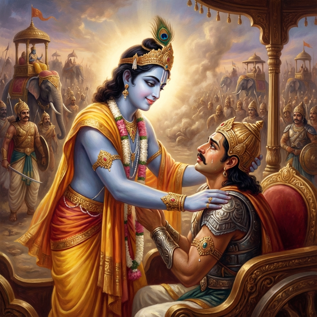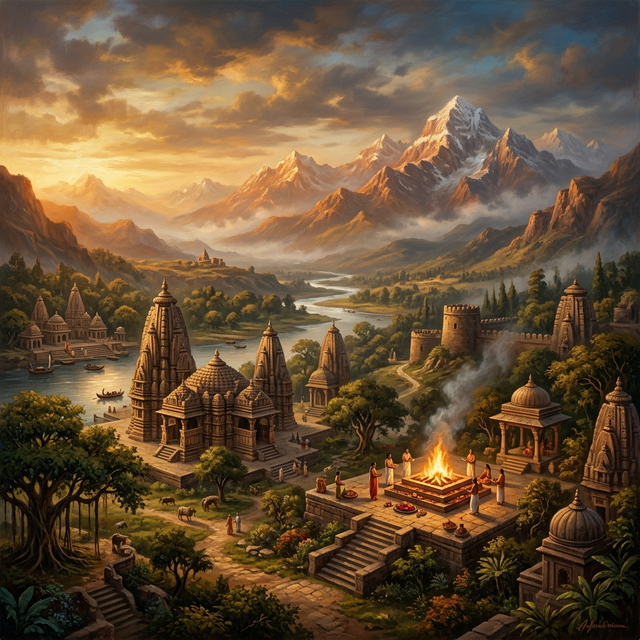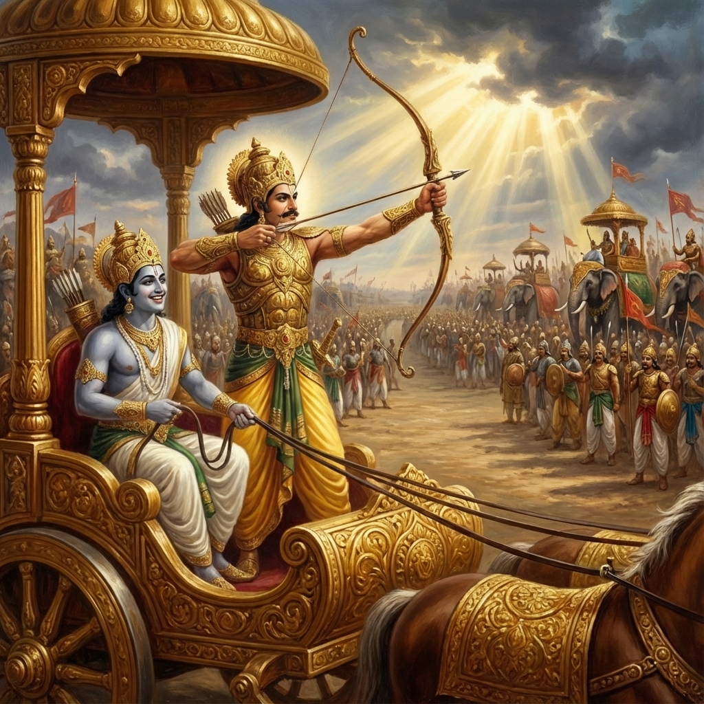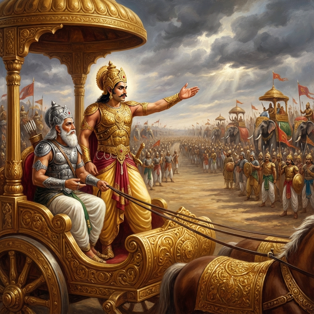 One of the two major Sanskrit epics of ancient India, narrating the struggle between two groups of cousins in the Kurukshetra War and the fates of the Kaurava and the Pandava princes.